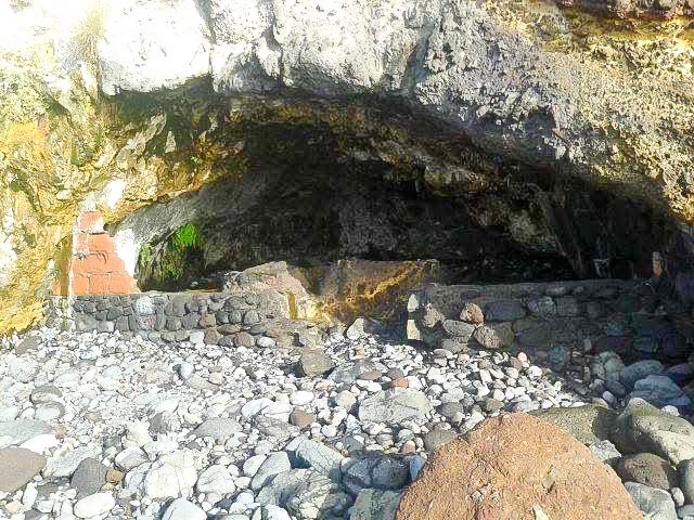 Desde el techo de la cueva caen gotas de agua dulce y crecen helechos. En la entrada hay una pared de piedra en ruinas y unas canalizaciones para recoger el agua que cae del techo y que servía de lugar de aprovisionamiento.